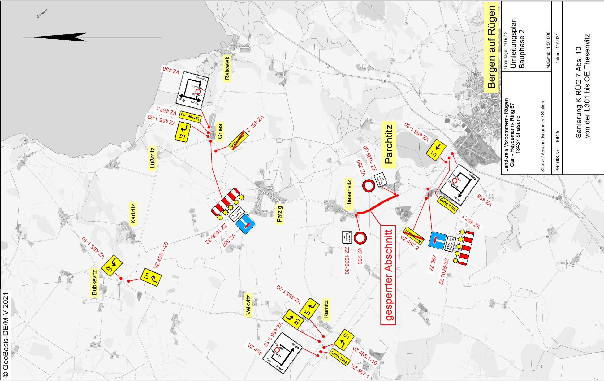 Die gesamte Baumaßnahme wird unter einer Vollsperrung der Kreisstraße RÜG 7 ausgeführt. Der Verkehr wird über eine entsprechende Beschilderung umgeleitet.
