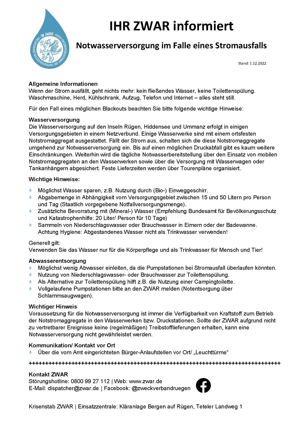 Beachten Sie bitte auch immer unsere regelmäßigen Facebook-Posts auf der ZWAR-Facebookseite www.facebook.com/zweckverbandruegen, sowie entsprechende Aushänge und Informationsblätter bei den Bürger-Anlaufstellen, den sogenannten „Leuchttürmen“ in Ihrer Gemeinde.